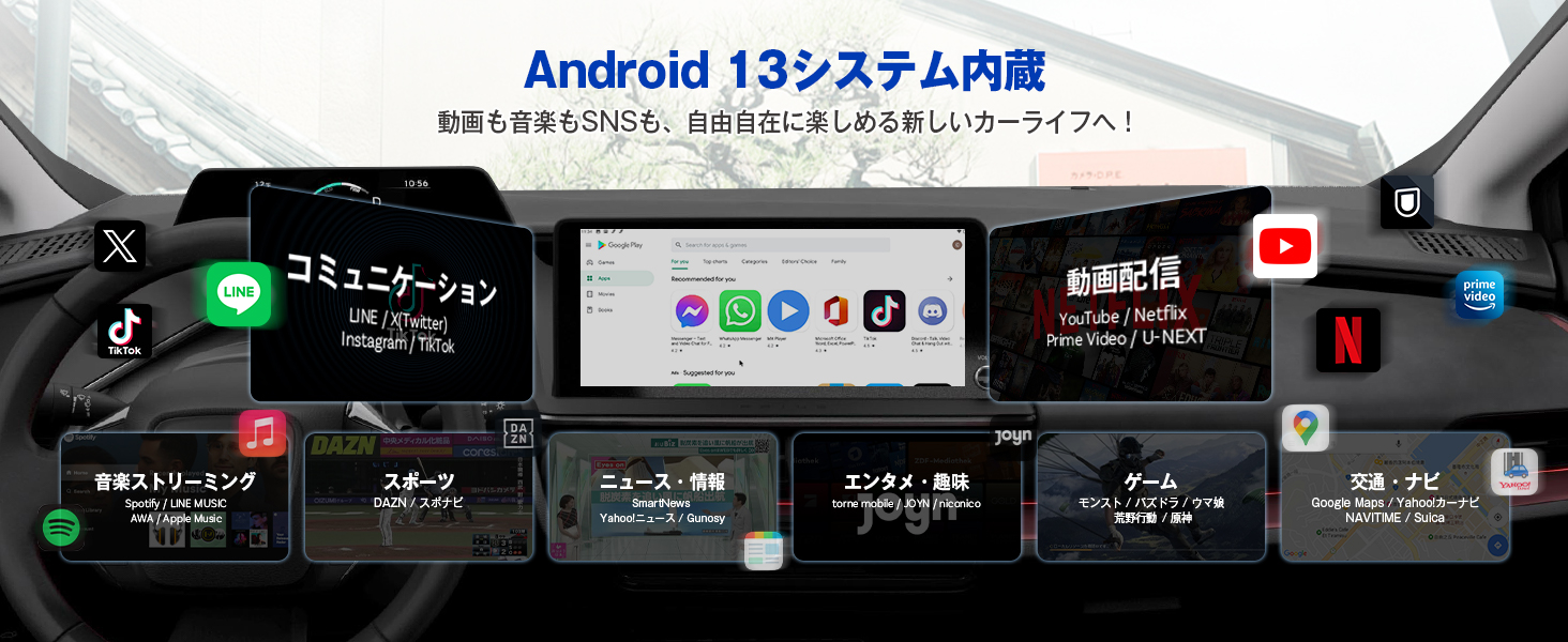 動画視聴・音楽・ナビゲーション・SNS・ショッピング・ゲームなど、車内エンターテインメントの幅がこれまでになく広がります。