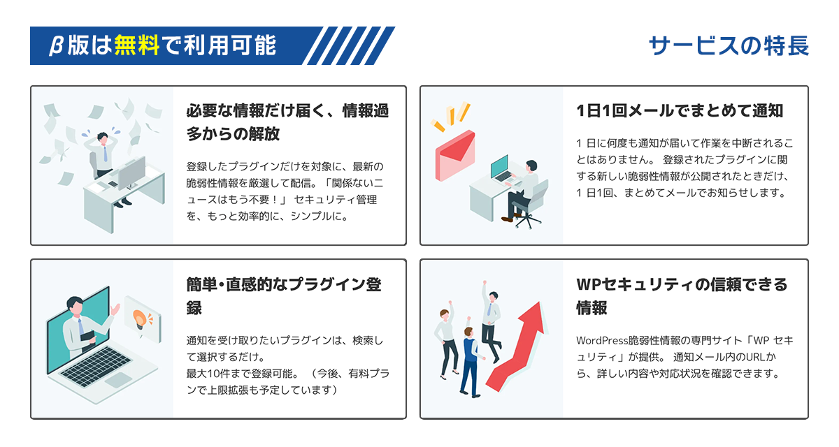 登録したプラグインに限定して最新の脆弱性情報を配信します。セキュリティ管理を効率的かつシンプルに行えます。