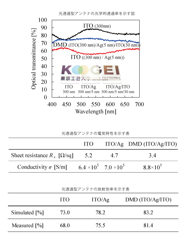 従来、国内外で発表されてきた透明なアンテナの多くは、ITO(酸化インジウムスズ・スマホのタッチパネルなどに使われる素材)透明導電膜を用いたものであり、放射効率は50~60%程度に留まるなど、高いアンテナ放射効率を得ることが困難でした。本研究では、金(Au)や銀(Ag)などの導電率の高い金属薄膜を、ITO などの誘電体薄膜で挟み込む「誘電体―金属―誘電体(Dielectric-Metal-Dielectric; DMD)」構造を採用し、放射効率と透明性がともに高くなる構造を明らかにしました。これにより、高い放射効率と高い透明性の両立を実現しています。