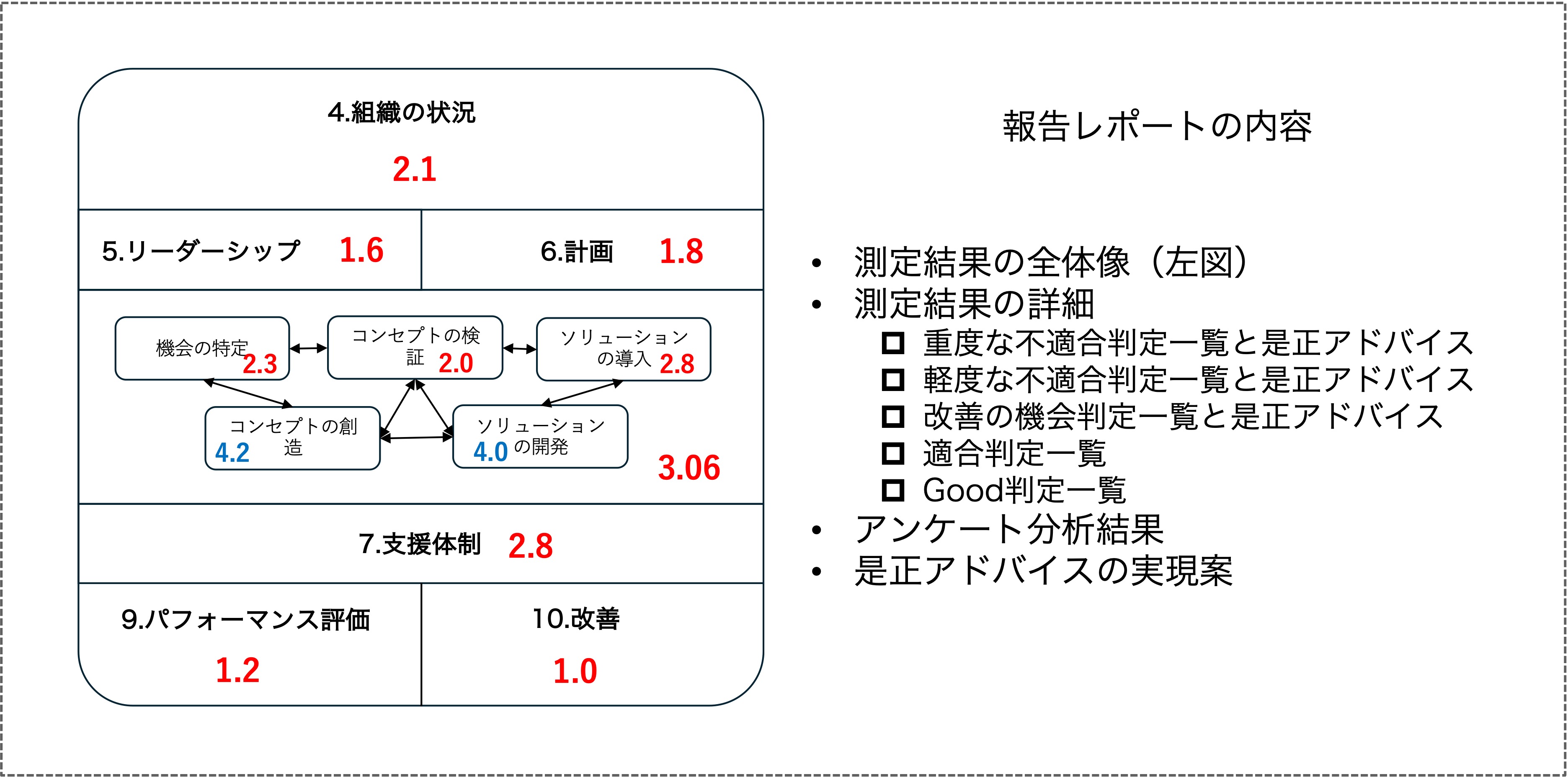 この測定結果に基づき、現在の組織の状態を客観的に把握するとともに、優先的に取り組むべき課題や具体的な改善策を判断できるようになります。