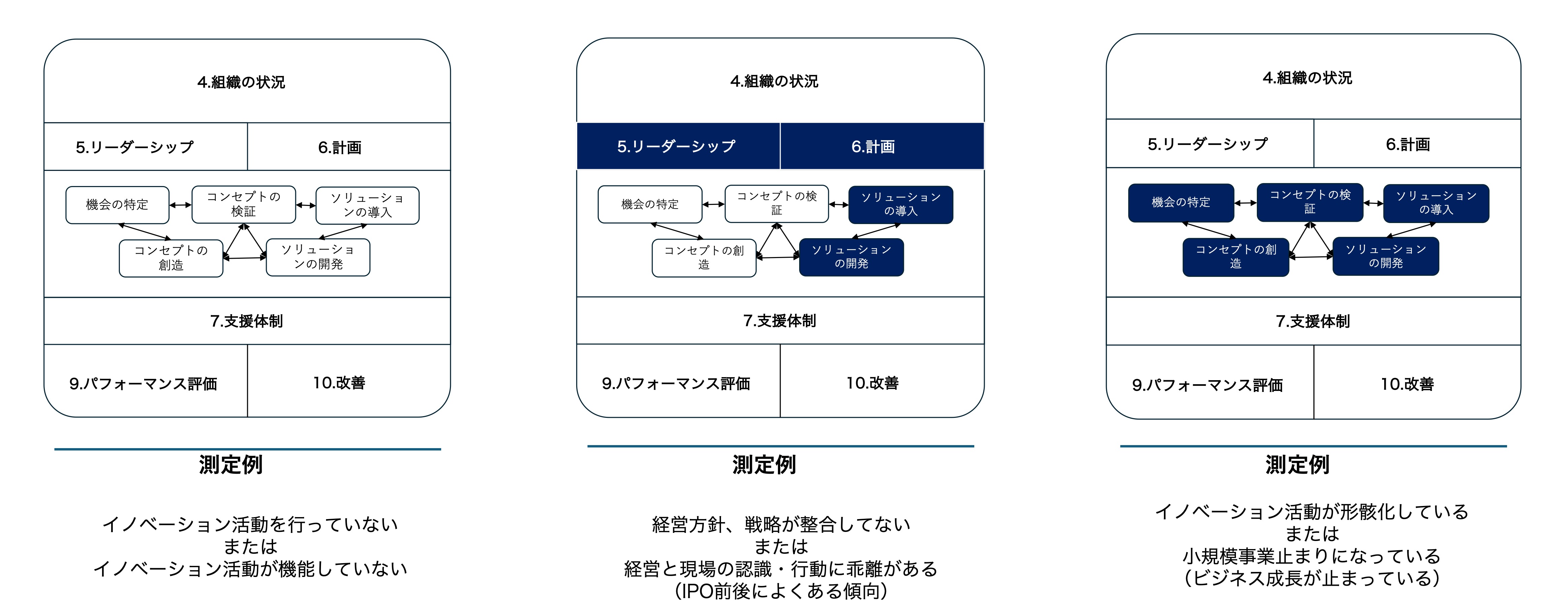 本サービスでは、ビジネス組織が「価値を創出・実現しながら成長できる状態にあるか」を、ISO56001の要求事項ごとに5段階で数値評価します。