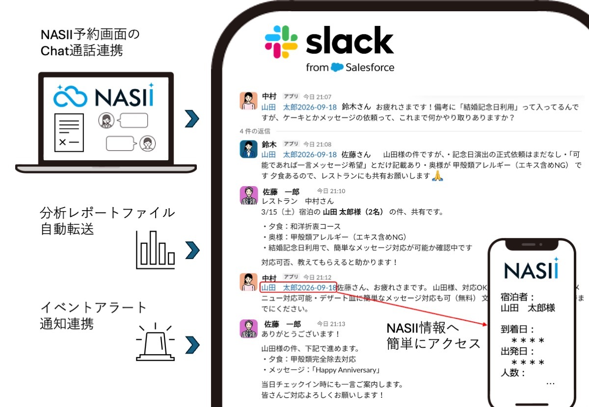 株式会社NASII(本社:東京都八王子市、CEO:細江 弘紀)は、業界初※となる、SalesforceとSlackを連携させ、チャット対応、レポート共有、イベント通知をSlack上で一元管理できる業務支援機能の提供を開始しました。