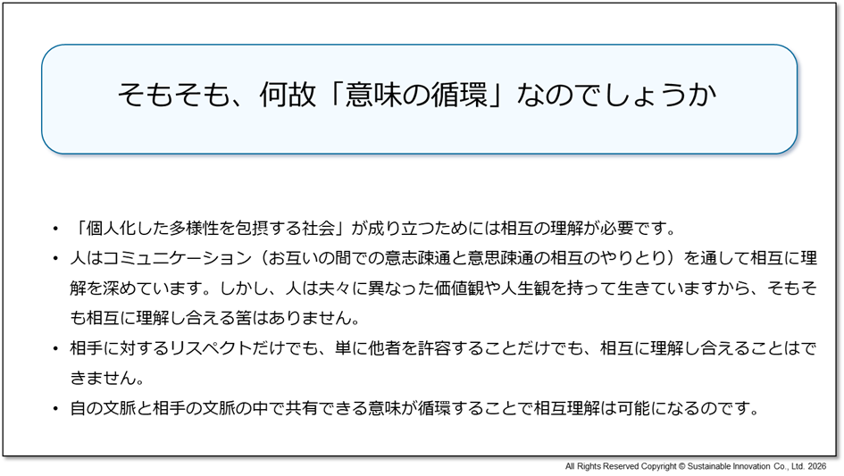 当社は、社会や組織が持続可能な発展に対応していくためには、個々の行為の背後にある意味が、相互のやりとりを通じて生成・変容し、社会へと還元されていく循環構造そのものを捉え直す必要があると考え、本サービスを開発しました。