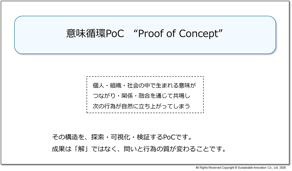 サステナブル・イノベーションズ株式会社(本社:東京都港区、代表取締役社長:池邊 純一、以下 当社)は、人・組織・社会の間で生まれ、変容し、巡り続ける「意味の循環」に着目し、個人の内側に立ち上がる意味から社会的価値の創出までを一貫して探索する新しいPoC型サービス『意味循環PoC』を1月15日(木)より提供開始いたします。