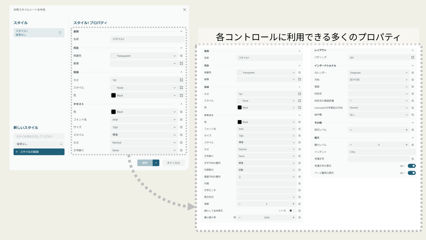 また、複数の帳票間で、背景色やフォント設定などの外観設定(スタイル)を共通して管理・変更できる「レポートスタイルシート」を搭載しました。枠線・余白・テキスト揃えなどの幅広いデザインプロパティをスタイルとしてまとめて管理でき、各レポート部品への適用・再利用が柔軟に可能となります。