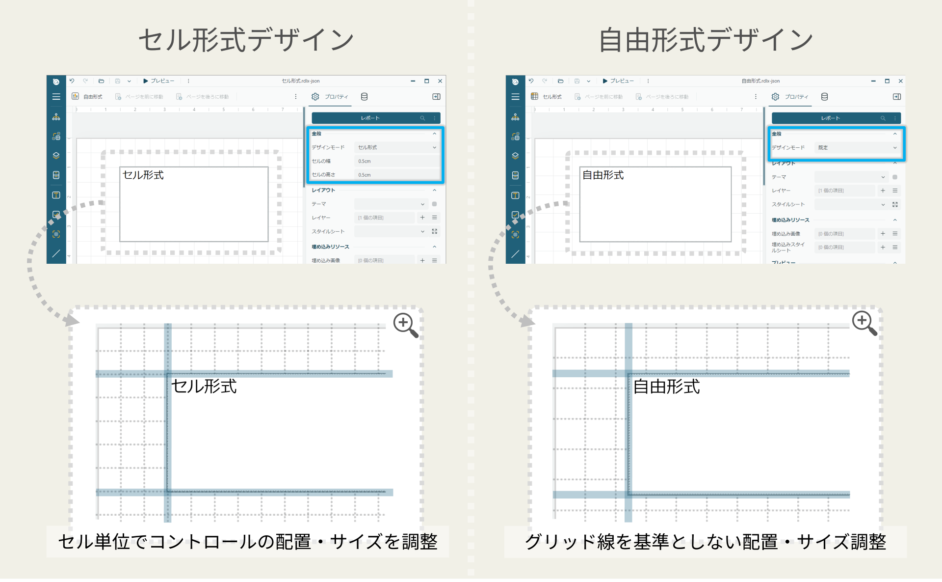Excelのようにセル単位でコントロールの位置やサイズを決定できる「セル形式デザイン」が新たに追加されました。レポートデザイナに追加されたプロパティ「デザインモード」を使用することで、従来の自由配置によるデザイン方法と切り替えることが可能です。