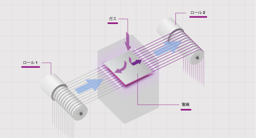 こうした実績やノウハウを踏まえ、今回開発した糸並列型大気圧低温プラズマ装置では、N2、O2、CO2、Airなど多様なガスを1台で安定してプラズマ化できるマルチガス技術を採用。希ガスに依存しない運用も可能で、濡れ性や接着性の改善など、素材・用途に応じた最適な表面改質を、ランニングコストを抑えながら実現します。