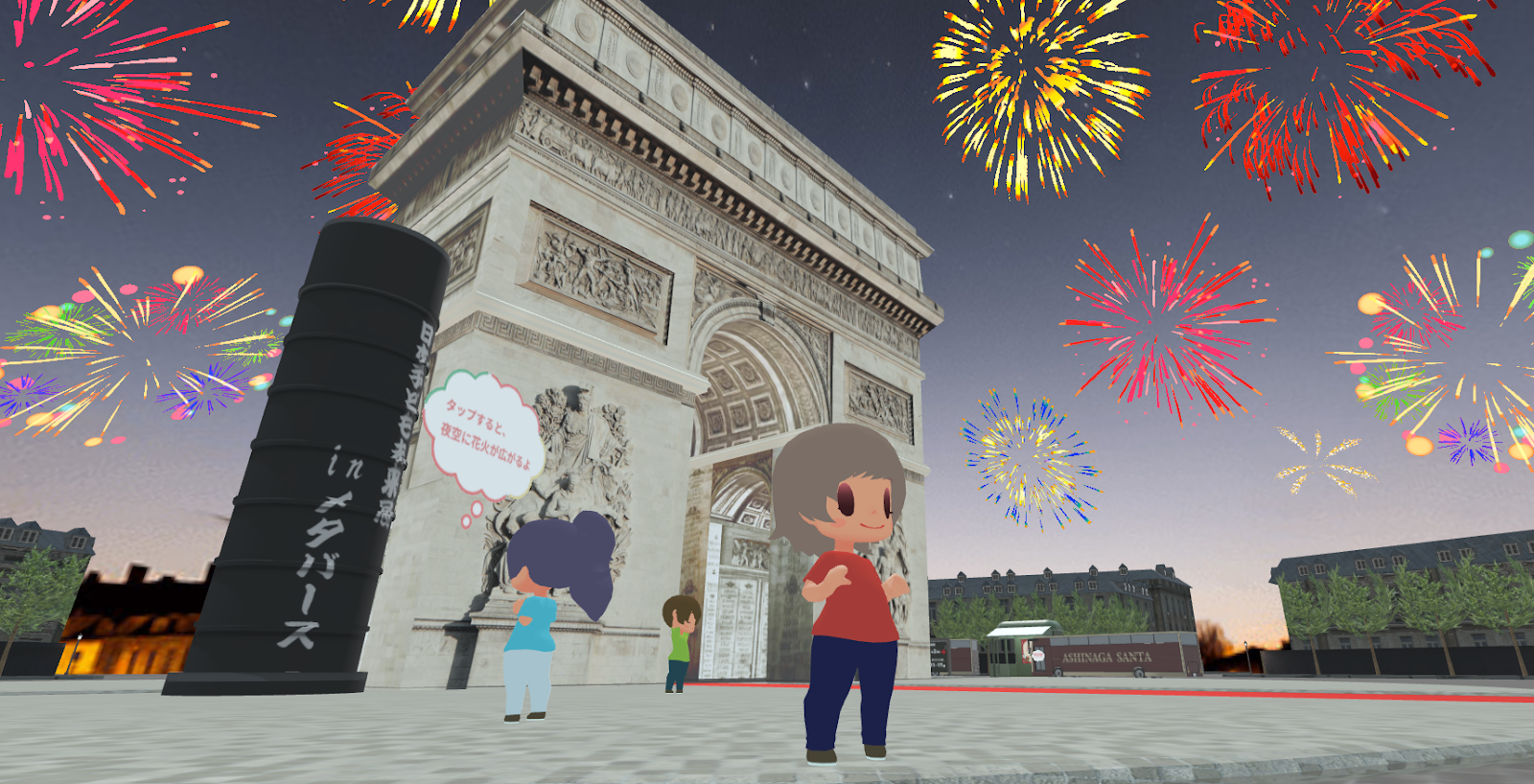 この展示は「日本子ども未来展inメタバース」として、凱旋門を中心としたパリの景色を舞台に、人工衛星データを活用して設計されたバーチャル空間で行われました。来館者は児童養護施設の子どもたちの作品を、未来型の没入体験として楽しむことができます。パリの景色の中に、クリスマスツリーが飾られ、花火が夜空を打ち上げるなど、様々な楽しめる試みがされていました。パリの街並みの他に、年齢ごとに展示作品のブースが分かれており、実際の美術展のように、観て回る楽しさ・工夫がされていました。