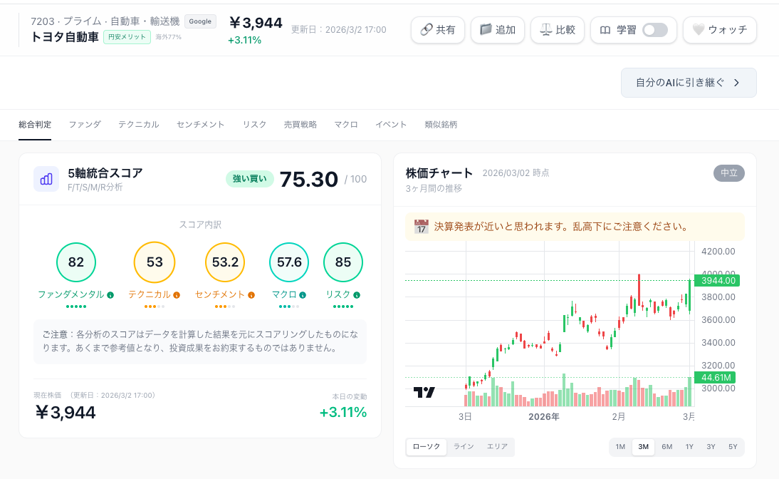 本サービスは、公開情報を基にした分析結果を提供するものであり、特定の金融商品の売買を推奨するものではありません。最終的な投資判断は、ご自身の責任において行ってください。