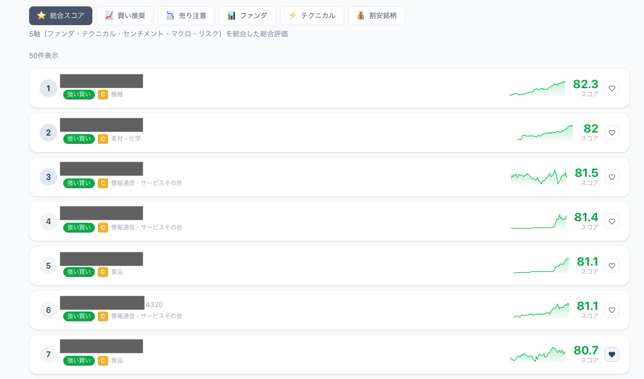 そんな悩みを解決するために、AIが東証公式データと決算情報を自動で分析。ファンダメンタル(業績・財務)とテクニカル(株価の動き)の両面から、銘柄ごとに5つの軸でスコア化し、強みと弱みを見える化します。