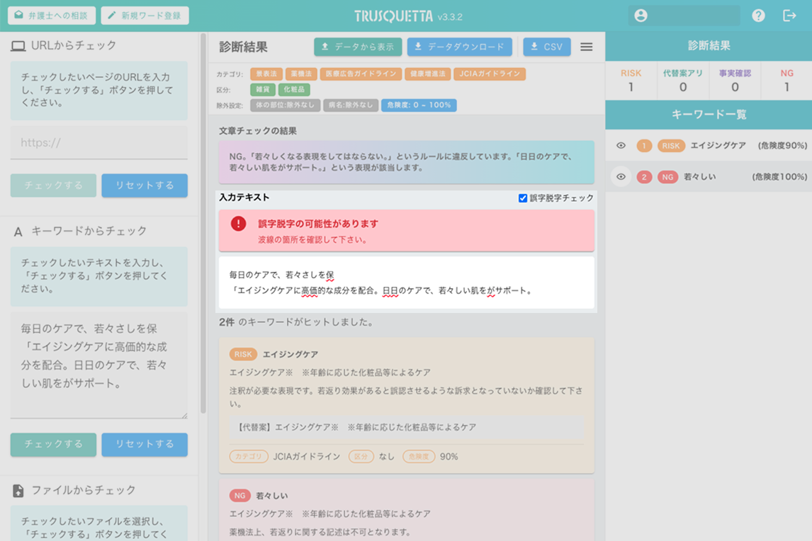 TRUSQUETTA(トラスクエタ)では、広告や記事作成時のキーワードチェック機能に新たに誤字脱字チェックを追加しました。