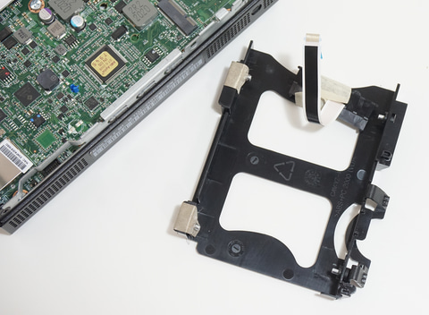 簡単だったのはThinkCentre M75q Tiny Gen2だ。背面のネジを1本外すだけで、前面と一体化した天板が前面にズレて外せる。さらに底面のカバーを前面側に引っ張り出すと、メモリスロットやM.2スロットにアクセスできる。今回取り上げた中では、もっともラクに作業できた。