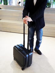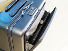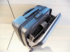 フロントポケットに14型ノートPCを収納できるキャリーケース。本製品を選んだポイントは、細部までしっかりと作りこまれている上、スマホなどのデジタルガジェットや名刺入れといったビジネス小物を収納できるポケットを多数装備されている点。
