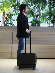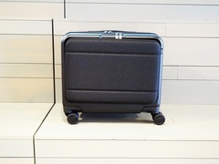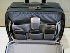 フロントポケットに13.3型ノートPCを収納できるキャリーケース。前述の製品と同様、細部までしっかりと作りこまれている上、スマホなどのデジタルガジェットや名刺入れといったビジネス小物を収納できるポケットを多数装備する。