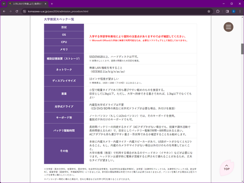 学部ごとの要件基準はかなり異なっていて興味深い。たとえば仏教学部はノートPCが絶対で、タブレット型は完全に不可。第11世代以降のCoreシリーズで6コア以上のもの、MacだとApple M1/M2が推奨されている。対して文学部系の学科はWindowsのみを対象としていて、Macは一切不可だ。