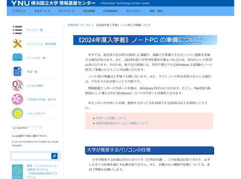 横浜国立大学では、「情報基盤センター」のWebサイトにて2024年度入学者向けのPC関連情報を提供している。これによれば、2024年度には学内PC教室が廃止。よって学生個人によるPC所持が実質的に必須化される。