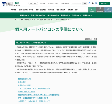 入試情報サイトの段階で、学生生活におけるノートPCの必要性を強調している。ちなみに理系学部では全学生にノートPCが貸与されるので、逆に言うと文系学生は自身でノートPCを選ばなければならない。それも、通学時に持ち運びできるという前提で、だ。