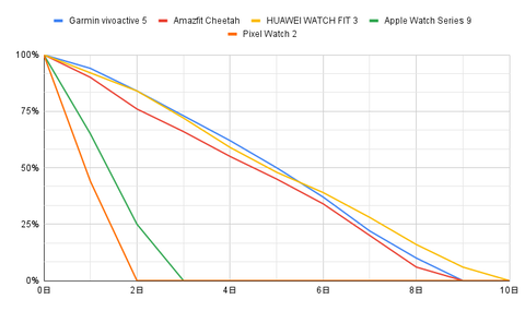 結果を見てもらえば分かるのだが、 3機種ともに10日には達しなかったものの、1週間は余裕でバッテリが持つことが分かった。 いずれの機種も1日に消費するバッテリ量は多くて15%未満。1日に3分の1から半分程度のバッテリを消費するApple Watch Series 9やPixel Watch 2と比べると、いかにバッテリ消費が少ないかが分かるだろう。