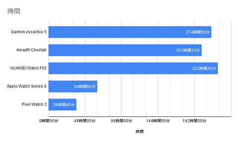 なお、今回はこれら3機種に加え、比較対象として「Apple Watch Series 9」と「Pixel Watch 2」でも同様の調査を実施している。これら2機種もテストの条件は同じだが、3機種の動作と合わせるためディスプレイの常時オン設定だけは「オフ」にしている。