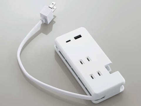 25cmという短めのケーブルを、側面に巻き付けて収納できるコンパクトな電源タップだ。3基のコンセントのほか、USB Type-AとUSB Type-Cの充電ポートを1基ずつ装備しており、充電ポートは合計で15W(5V/3A)までの出力に対応する。