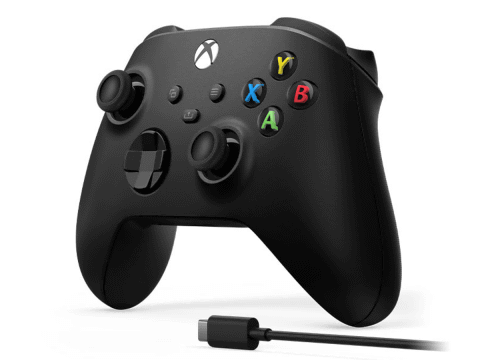 8方向ボタンや2基のアナログレバー、アナログ対応のトリガーボタンなどを備えたゲームコントローラだ。Xbox Series X|Sに付属するMicrosoftの純正コントローラだが、BluetoothやUSBケーブルで接続することでWindows 11でも利用できる。握り手部分には滑り止め加工が施されており、両手でしっかりと握って操作できる。