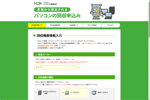 クリックすると同社のホームページが表示されるので、そこにある「回収お申込み」というリンクをクリック。すると再びパソコン3R推進協会のホームページへと戻るので、「申込み画面へ進む」をクリックする。いったん外部サイトにジャンプしたあとまた戻って来る形になるので、少々ややこしいといえばややこしい。