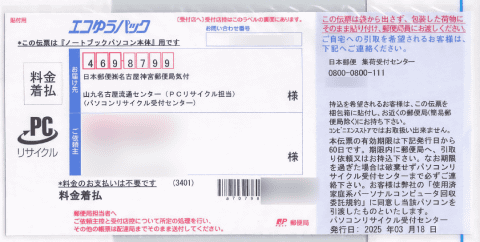 以上のようにオンラインでの申込(または費用の振込)を終えると、数営業日を経て、対象PCを発送するのに必要な「エコゆうパック」伝票が郵送で届く。あとは梱包を行ない、郵便局に持ち込むか、あるいは集荷を依頼し、発送を行なえばよい。ノートPC程度の重さであれば、重量のあるデスクトップPCやディスプレイと違い、持ち込みも可能だろう。