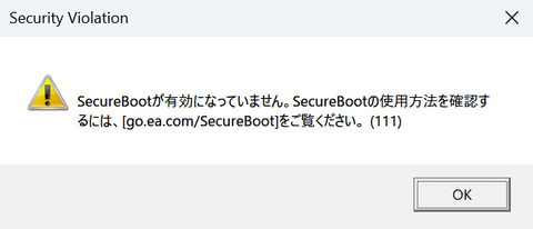 Windows 11環境であればセキュアブートは有効化されている可能性は高いが、もしBattlefield 6に起動時に「SecureBootが有効になっていません」と表示された場合、設定を確認しよう。ここではWindows 11での例を紹介する。