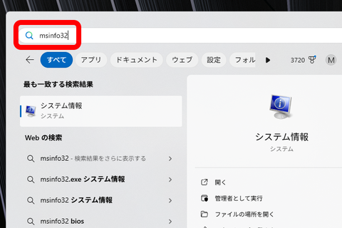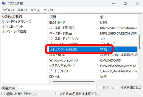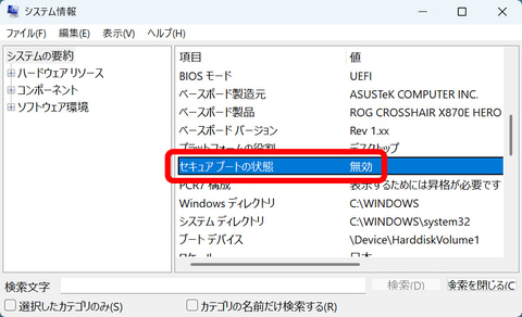 まず、セキュアブートが有効になっているかはWindowsの検索窓に「msinfo32」と入力して「システム情報」を起動。画面右側のメニューから「セキュアブートの状態」を確認する。もし「無効」になっていたら、UEFIメニューにアクセスしよう。