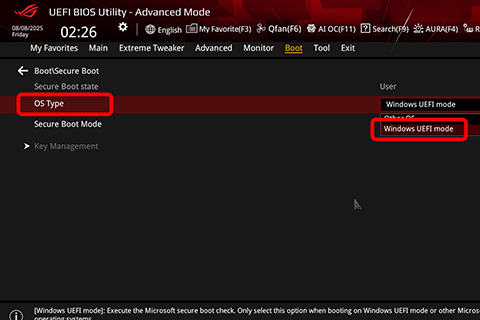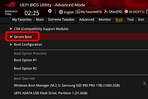 まずはASUSの「ROG CROSSHAIR X870E HERO」の例を紹介しよう。UEFIメニューにアクセスし、上部メニューの「Boot」を選択。「Secure Boot」内の「OS Type」を「Windows UEFI mode」にする。これでセキュアブートが有効だ。「Other OS」を選ぶとセキュアブートが無効になる。