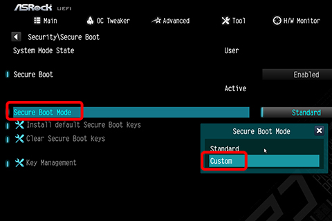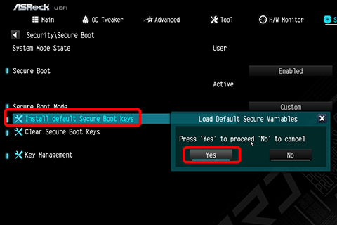 ASRockの「Z790 Pro RS WiFi」では、上部のメニューを「Security」に移動し、「Secure Boot」内にある「Secure Boot Mode」の設定を「Custom」に変更。さらに「Install default Secure Boot keys」を開いて、「Yes」を選択。これでセキュアブートが有効になる。