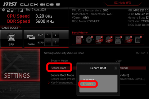 MSIの「MPG Z690 CARBON WIFI」では、「SETTINGS」→「Security」→「Secure Boot」とアクセスして「Enabled」に変更すればOKだ。これでセキュアブートが有効に変化する。