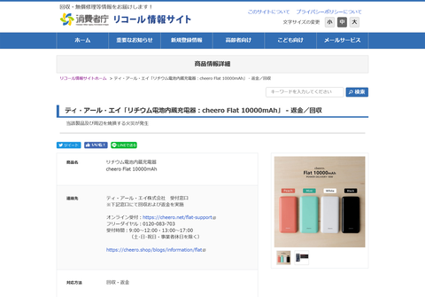 本稿冒頭で触れた、cheeroのリコール対象製品は、本サイトに情報が掲載されている。