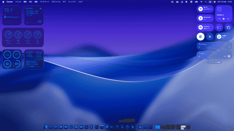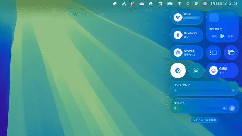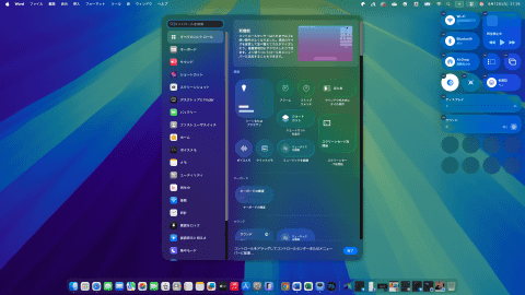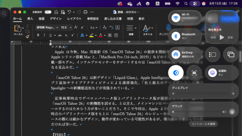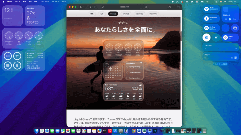 スマホライクに操作できるコントロールセンターには、前述の通り「Liquid Glass」が採り入れられており、展開していても下のウインドーや壁紙が透けて見える。もっと多くのコントロールを登録したとしても、デスクトップがより広く感じられるようになっている。