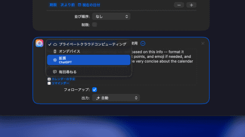 「macOS Tahoe 26」では「ショートカット」アプリに、Apple Intelligenceを組み込めるようになった。さらにここでは「プライベートクラウドコンピューティング」「オンデバイス」「拡張(ChatGPT)」のいずれで処理するかも選択できる。