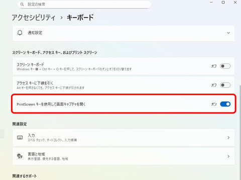 と、そんな昔の話はさておき、現在のWindows 11(のデフォルト設定)では、PrintScreenをただ押しただけだとスクショされない。画面が暗くなり、画面上部にスクショする範囲などを選ぶボタンが出現し、そこからさらに操作することで任意の範囲の画面イメージを取得できる、といった形だ。このPrintScreenキーの挙動はWindowsの「アクセシビリティ」設定で変更できる。