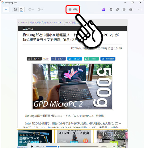 動画にはデスクトップで再生している音声を含められるので、操作説明だけでなく、(ウィンドウモードの)ゲームのワンシーンを切り取ってシェアしたいときにも活躍する。また、画面録画を終了するとプレビュー再生でき、ここで動画の前後をカットすることもできる。