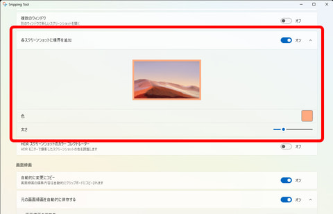 細かいところでは、スクショ画像に自動で枠を付加する設定も便利。これをオンにしておくと、プレゼン資料やアプリの操作マニュアルなどを作成する際、画像として貼り込むときにイメージの境界が判別しやすくなるため、完成度の高い資料に仕上げられそうだ。