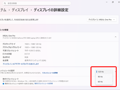 また、XREAL One Proは120Hzのリフレッシュレートに対応しており、最大120fpsのフレームレートでゲーム画面を表示できる。