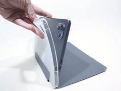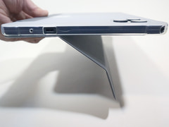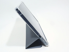 箱に入っているうちから装着状態となっているカバー付きケースはソフトタイプで簡単に着脱が行なえる。カバー部は折り畳むことでスタンドとしても使えるが、マグネットは一切使っていないため、本体に吸着してディスプレイを保護するような動きはせず、下向きにすると重力に引かれてブラブラする。