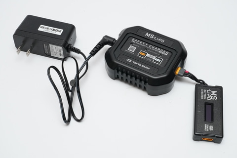 使っていて安心、かつラクなのは東京マルイ「MS•Li-Po セーフティチャージャー」。ケーブル1本で接続できるのは助かります。また、「電池温度異常検知」「電池電圧異常検知」「ACアダプター入力電圧異常検知」「充放電保護タイマー」「充電電流異常検知」「電池温度警告表示」の6つの保護機能が搭載されており、安心感が高いです。