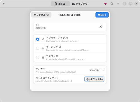 そのような事情もあって、理論上は任意のWindowsアプリケーションをWineで動かすことはできるものの、実際にやるとなると覚悟がいる状況が続いてきた。それを改善しつつあるのがWindowsアプリケーションのインストールを安全かつ簡単に実現できる「Bottles」だろう。Wineで鬼門となりやすいランタイムライブラリや日本語フォントのインストール、ロケールの設定などを、GUIから気軽にできる仕組みだ。