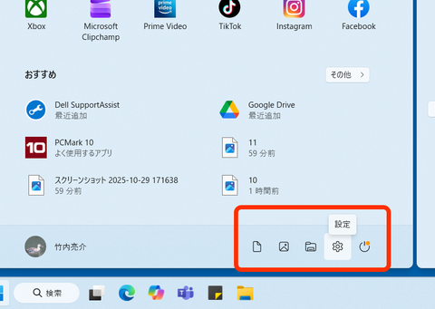 ちなみに、Windows 10ではスタートボタンの上に設定アプリやドキュメント、ピクチャフォルダの呼び出し用ボタンがあるが、Windows 11のスタートメニューにはこうしたボタンが標準で表示されない。
