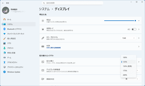 「ディスプレイ」からは「拡大/縮小」(画面表示のスケーリング設定)、ディスプレイの解像度、画面の明るさなどの設定を呼び出せる。スケーリングや解像度をプルダウンメニューから設定するのはWindows 10と同じだ。