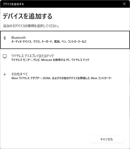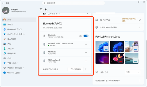 Bluetoothデバイスの追加もこのホーム画面から行なえる。同じくスクロールして左下にある「デバイスの追加」ボタンをクリックすると、Bluetooth機器を追加するウィザードが開始されるので、機器のタイプを選んで追加していこう。