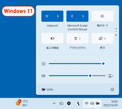 Wi-Fiや音量、ノートPCなら輝度などをタスクトレイから設定することもあるだろうが、ここにも変更が加わっている。Windows 10では、それぞれ設定したい機能に沿ったアイコンをクリックしなければならない。しかしWindows 11では、こうしたよく使われる設定項目がタスクトレイにひとまとめにされており、簡単にアクセスできる。
