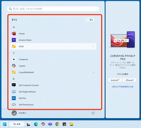 Windows 11でアプリメニューを表示するには、右上にある「すべて」というボタンをクリックしよう。するとインストールされたすべてのアプリのリストが表示される。