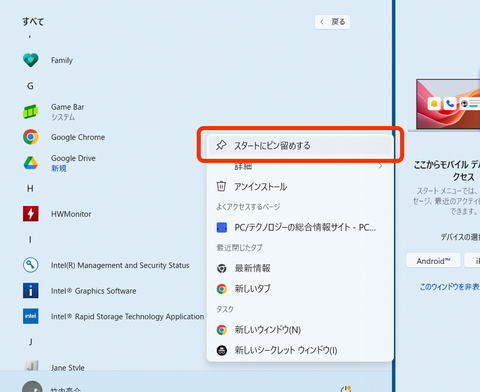 Windows 11のピン留めは、Windows 10のタイルメニューに機能としては近しい。よく使うアプリは、右クリックメニューからスタートメニューにピン留めしておこう。