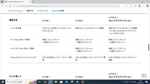 ほかにも、Microsoft Rewardsへのショートカットをタスクバーにピン留めすることで50ポイント、Microsoft Rewardsのダッシュボードページに掲載されているコンテンツにアクセスすることで数十ポイント、それぞれ獲得できる。さらに友人にMicrosoft Rewardsを紹介することで月最大15,000ポイントゲットできるので、早ければ即日1,000ポイント達成も不可能ではない。