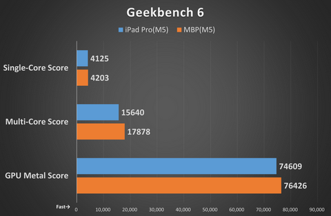 つまりプロセッサは、「11インチiPad Pro(M5)」(以下iPad Pro)が9コアCPU[高性能コア×3、高効率コア×6]、「14インチMacBook Pro(M5)」(以下MBP)が10コアCPU[高性能コア×4、高効率コア×6]だ。高性能コアの数に差があることを踏まえて、ベンチマークスコアを見ていこう。